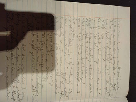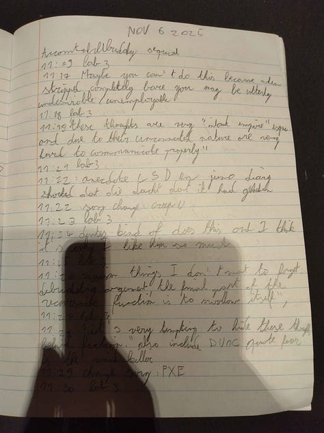 On a recent LSD trip I eloquently wrote: “noone seems interestwd inamypre in the activity of challenging oit your own ego to a figjt ahdn stomping them and just watching and seeing what happens its like noone understands”1 I think that’s exactly what this all is. But seemingly no one shares this impulse with me. I feel naked and alone.