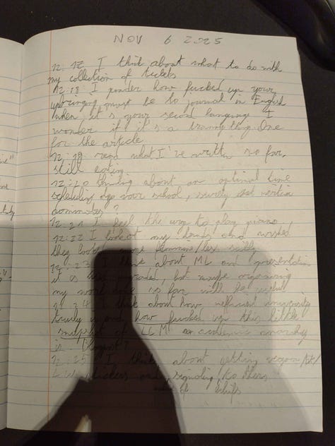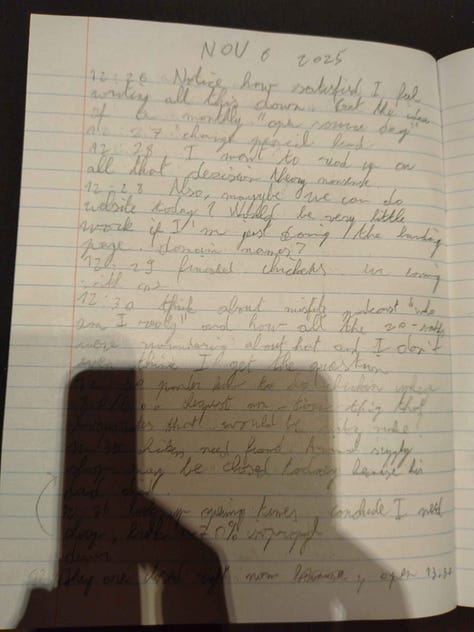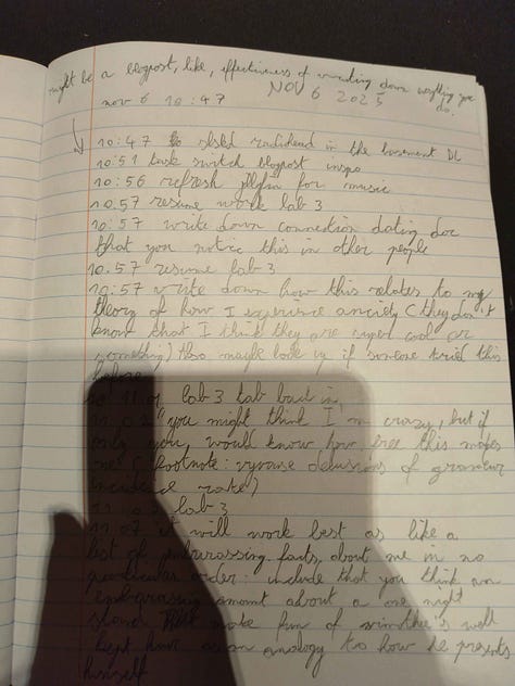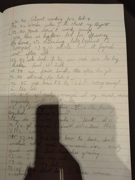 I’ve tried to actualize the fantasy. Construct an obsidian doc documenting my mind. But it’s not enough. Living through time is incredibly lossy. I need to write down every single one of my thoughts and actions. Realtime.