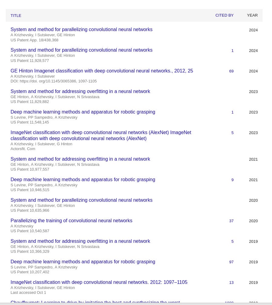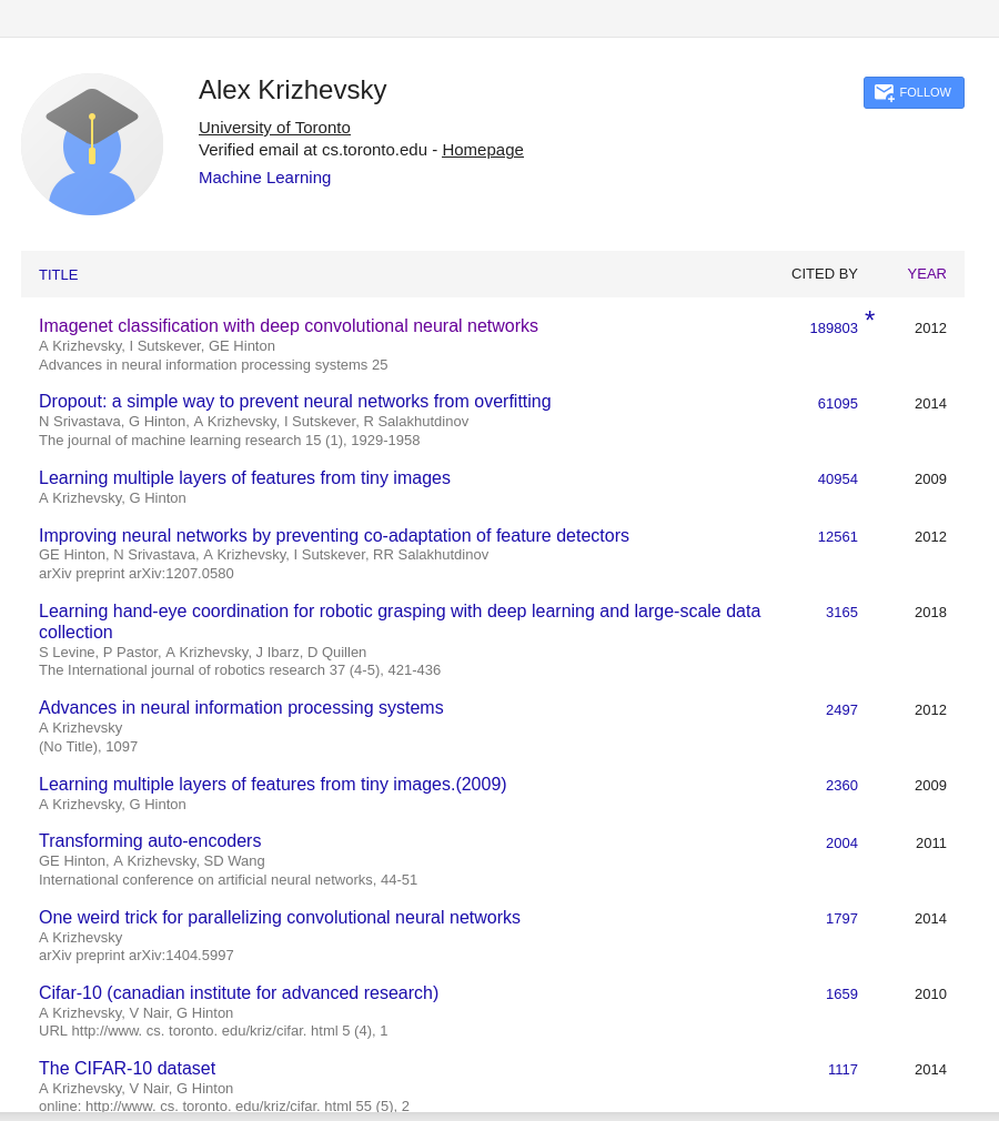 It’s first author??? Yes. Along Hinton and Sutskever is a guy named Alex Krizhevsky. He is very much not a household name. His google scholar looks like this.