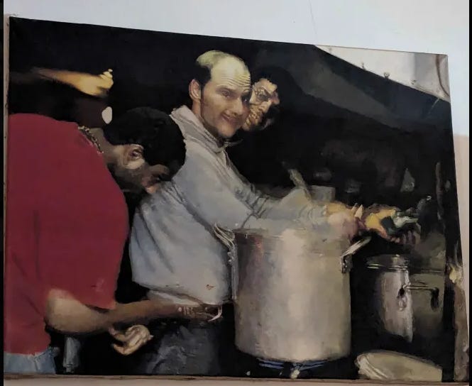 The place where we eat is kind of cool. it’s all volunteers and operates on donations. When I’m queueing to get food I meet a guy I chatted with earlier at EAG. “This is my sister” he says. I off-handedly mention that “this painting looks very disco-elysium to me”. I don’t think he knows what that means, but his sister turns to me and says “yeah haha, totally”. Just like that my suspicion is confirmed: this is a fellow trans woman.