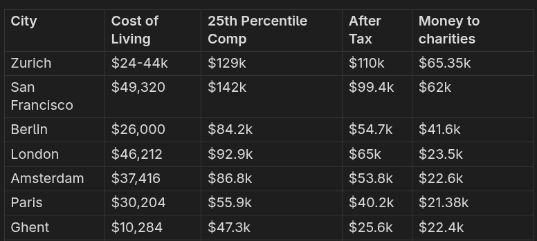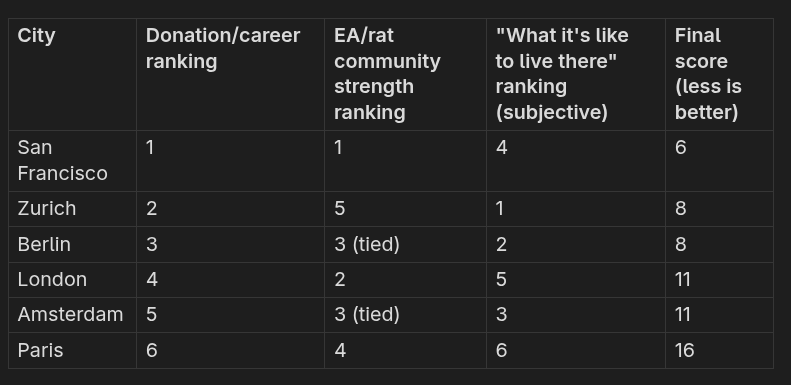 Someone in the comments inspired me to do a more thorough breakdown of the “optimal“ cities. This was going to be a necessary exercise for me to do eventually anyway, and I figured I might as well have it double as a blog post, because I think the “EU passport, fresh compsci grad, WEIRD, wants EA/rat community and is looking for what city to move to” is quite a common situation!