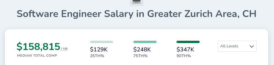 Zurich wages are crazy good. Know that we’re again dealing with selection bias because of the insanely competitive job market. The 25th percentile yearly comp is $129k. With help from my Swiss friend we got an effective tax rate of around 15% (tax brackets lower because of donations)5, so let’s call it a clean $109.65k